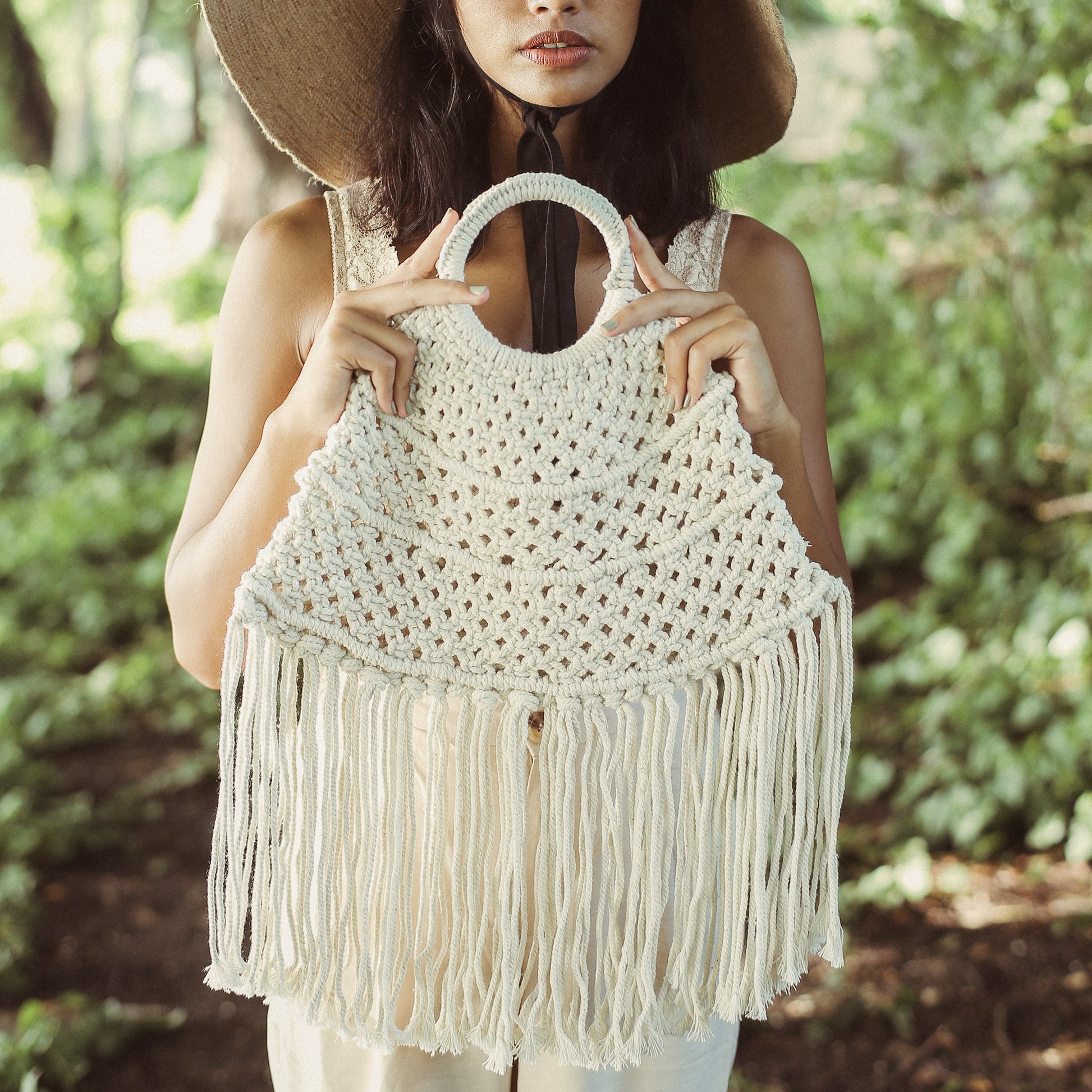 Irresistible handwoven macrame bag with unique fan shape and long fringe details. Made for perfect outings at the beach or countryside. Spacious to carry your summer vizor or your favorite tumbler (and plenty of hand ).