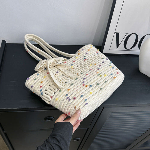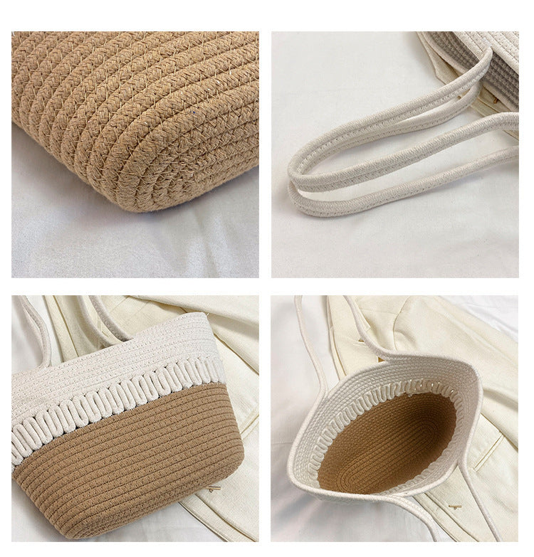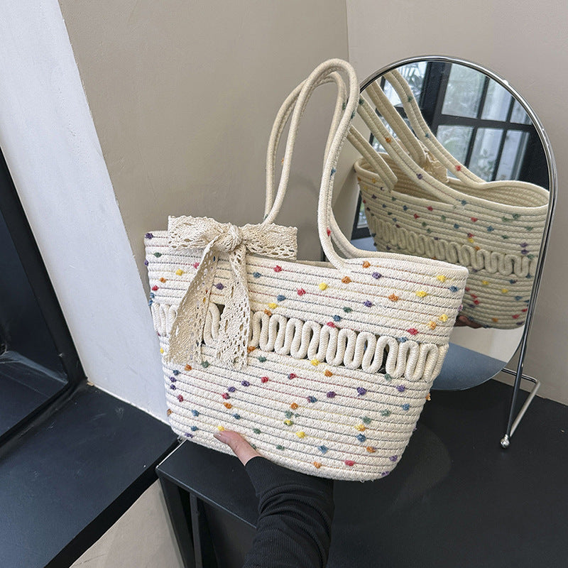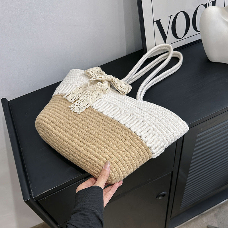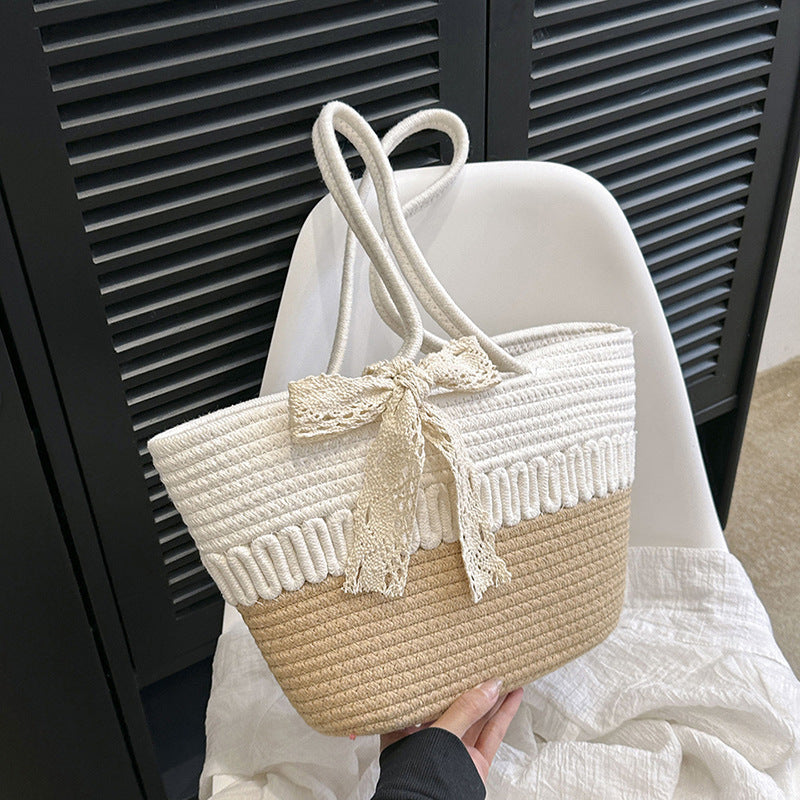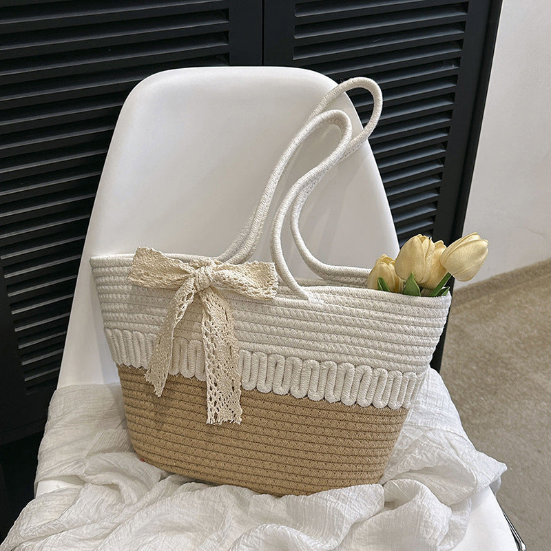 This woven bucket-style tote with a removable silk scarf detail is your effortless go-to for city strolls, beach walks, or chic daily looks.